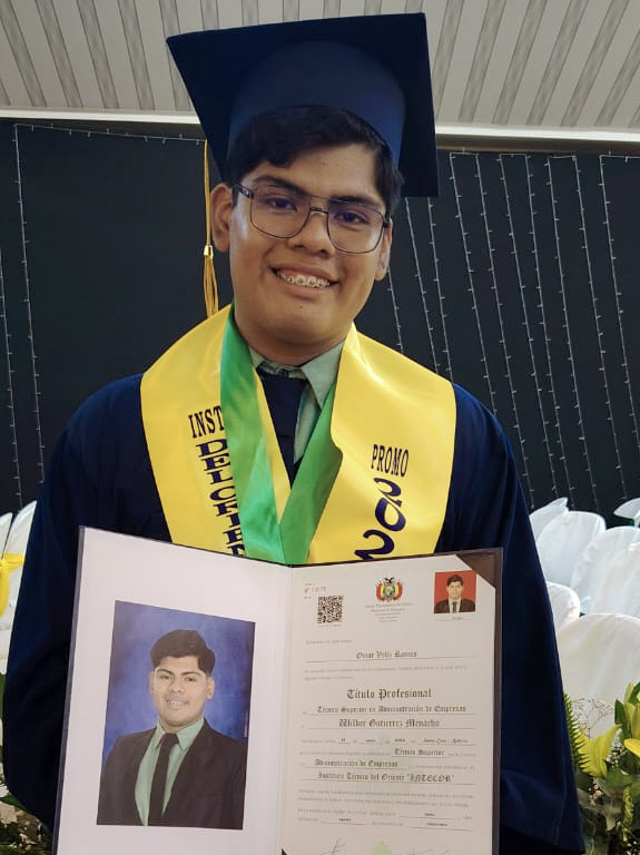 "Con esfuerzo, disciplina y fe, Wilber culminó sus estudios en Administración de Empresas. Su logro refleja el valor del trabajo constante y el deseo de superación que caracteriza a nuestros jóvenes."